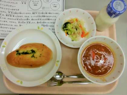 ガーリックフランス、牛乳、ブロッコリーのサラダ、ビーンズシチューです。