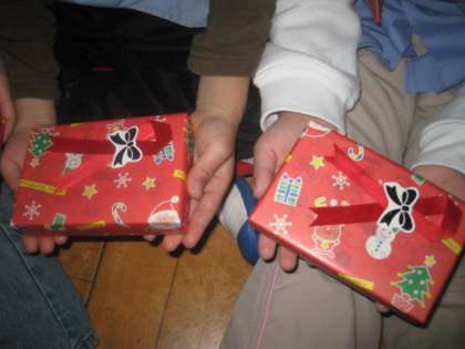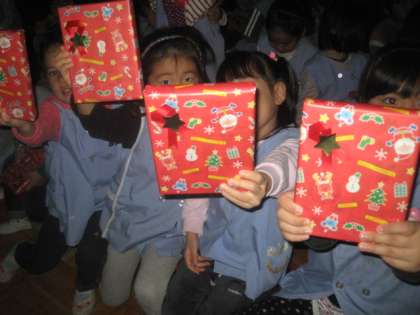 サンタさんからもらったプレゼントは、年少さんと年長さんはそれぞて違っています。何だったでしょう。家に持って帰ってあけることになっています。うれしいな・・・・。楽しみだなあ・・・。