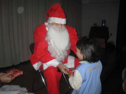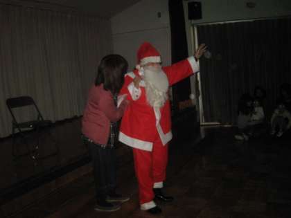 今日はお楽しみ会でした。先生たちがマジックをしてくれました。すごーいと驚きです。あわてん坊のサンタクロースの歌を歌っていると、遠くから鈴の音が・・・・・・。サンタさんが幼稚園にプレゼントをもってやってきてくれました。園長先生が呼んでくれたのです。サンタ語で話すと・・・・。プレゼントをくれるって・・・・。