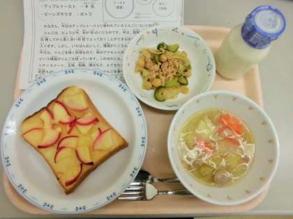 今日は、アップルトースト、牛乳、ビーンズサラダ、ポトフです。