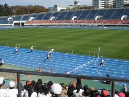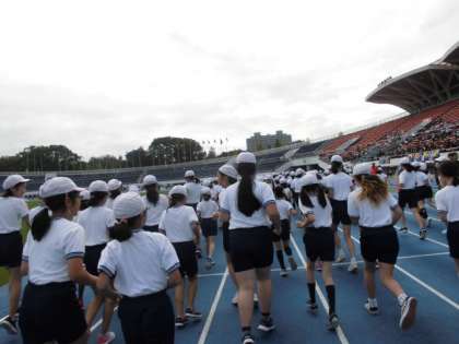 今日は、駒沢オリンピック公園の陸上競技場で連合運動会が開催されました。塚戸小の6年生も学校代表として参加しました。競技の内容は100m走、50mハードル走、走り幅跳び、走り高跳びと、代表選手の400mリレーです。6年生全員が、自分の全力を出し切って記録に挑戦しました。そして、仲間を応援し合い学年の団結力を深めることができました。