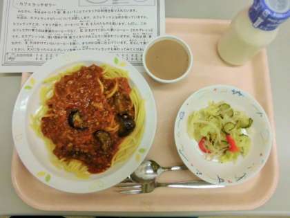 献立は、なすとしめじを入れた秋のスパゲティーミートソース、牛乳、バジルを使ったイタリアンドレッシングサラダ、カフェラッテゼリーです。