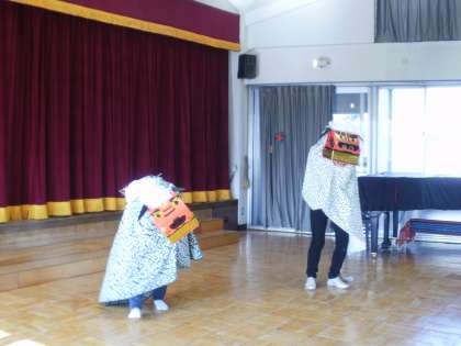始業式の後、幼稚園では、教頭先生と松原先生が獅子舞の踊りを披露しました。昨年、2人で一生懸命練習しました。子供たちは、福をもらいました。