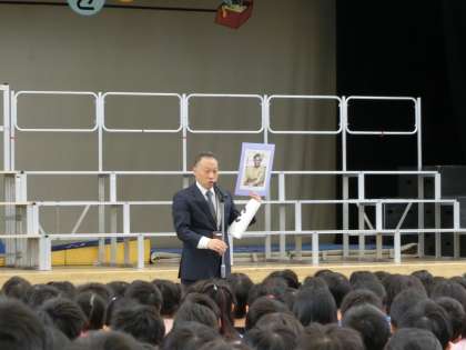 今日の朝は、あいにくの雨でしたので、体育館で全校朝会が行われました。まず最初は「もったいない」の話。ノーベル賞受賞者のワンガリ・マータイさんが、日本の「もったいない」という言葉を世界に広めてくれたことや、ある日の給食の残菜が23kgもあったという話をしました。落とし物がたくさんあるということなども含め、MOTTAINAIという言葉を大切にして、しっかり食べ、ものを大切にしたいですね。