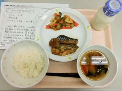 今日は、ごはん、鯖のみそ煮、シャキシャキ野菜、すまし汁です。