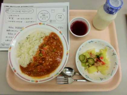 今日は、パセリライス、牛乳、ポークストロガノフ、ツナポテトのサラダ、ぶどうゼリーです。