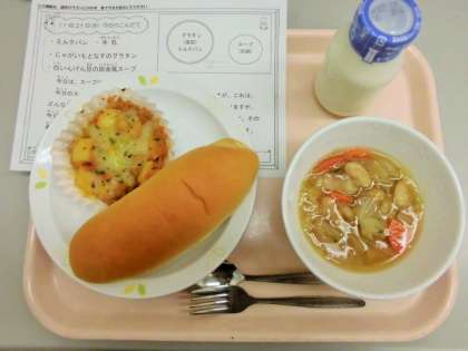 今日は、ミルクパン、牛乳、じゃがいもとなすのグラタン、白いんげん豆の田舎風スープです。
