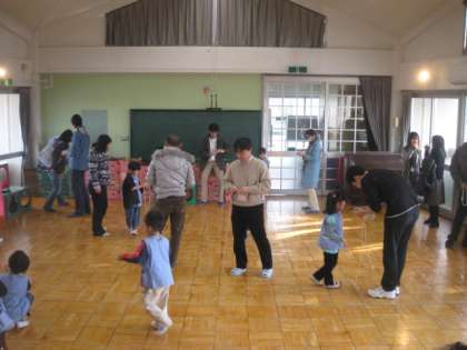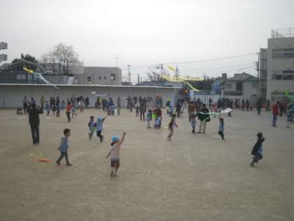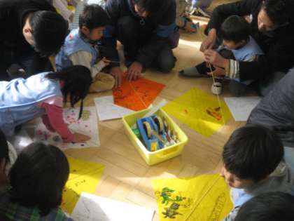 年長さんは、羽付きをしたり、駒を回したり、双六をしたりしていました。後半は、親子で凧を作って、小学校の校庭で揚げました。走り回りながら楽しんでいました。作ったものが高く揚がるのはうれしいものです。家に持って帰ってもっと揚げましょうね。