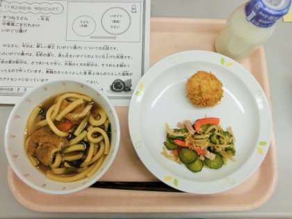 今日は、きつねうどん、牛乳、中華風ごまだれかけ、いがぐり揚げです。