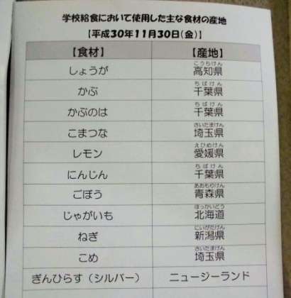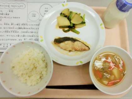 今日は、ごはん、牛乳、魚の照り焼き、かぶのレモン醤油かけ、利休汁です。