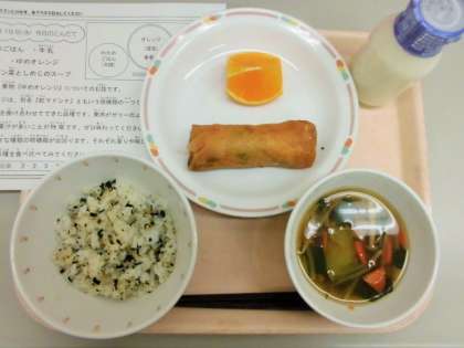 今日は、わかめごはん、牛乳、春巻き、チンゲン菜としめじのスープ、ゆめオレンジです。