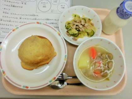 今日は、ビスキュイパン、牛乳、ハムと大根のサラダ、ポトフです。