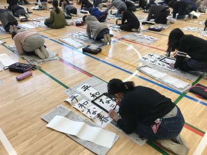今日、6年生が体育館にて書き初めを行いました。「平和な春」と一文字一文字、心を込めて書きました。