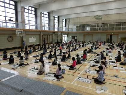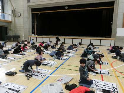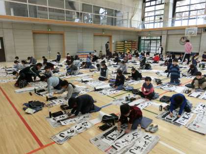 今日は3年生が体育館で書き初めを行いました。毛筆の学習は3年生からですから、初めて学年全員で取り組みました。まずは1分間心を落ち着かせてから本番に臨みました。どの子もとっても集中して一生懸命に取り組むことができました。