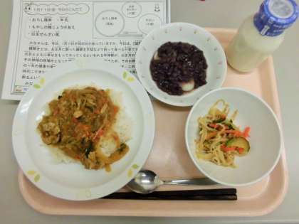 今日は、おろし豚丼、牛乳、もやしの梅醤油あえ、白玉ぜんざい風です。