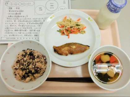 今日は、赤飯、牛乳、魚のゆずみそ焼き、はりはり酢の物、小松菜とおふのすまし汁です。