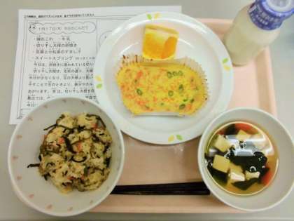 今日は、磯おこわ、牛乳、切り干し大根の卵焼き、豆腐と小松菜のすまし汁、スイートスプリング(みかん×はっさくの品種)です。