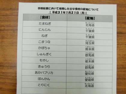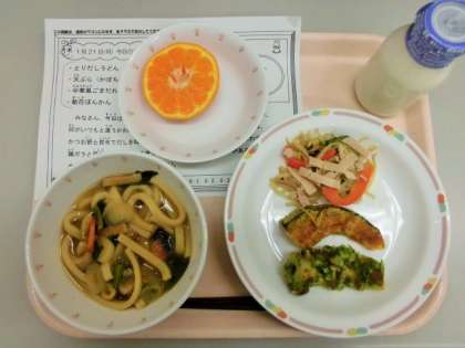 今日は、とりだしうどん、牛乳、天ぷら(かぼちゃ、ちくわ)、中華風ごまだれかけ、菊花ぽんかんです。