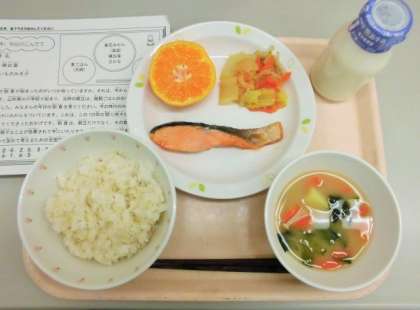 今日は、ごはん、牛乳、鮭の塩焼き、ラーパーツァイ、じゃがいもと小松菜のみそ汁、菊花みかんです。