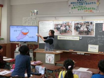 今週3年生は本校栄養士による、食育の授業がありました。今回のテーマは「食事のマナーについて考えよう」です。一緒に研究を進めている区内の栄養士の先生方も参観にいらした中、子どもたちは、良い例と悪い例を比較しながら、食事のマナーを守ることの大切さについて気付いていきました。この学習を生かして、ぜひご家庭でも話し合い、実践してみてください。