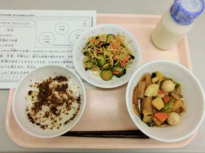 今日は、ごはん、牛乳、おかかかふりかけ、いかと大根のうま煮、カリじゃこサラダです。、