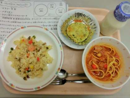 今日は、オリンピック・パラリンピック献立としてスウェーデンの料理であるメダリオンを取り入れました。メダリオンは、じゃがいもにブロッコリー、生クリーム、粉チーズ、などを混ぜて焼いた料理です。(写真一番下)