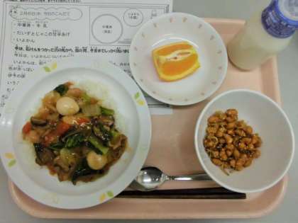 今日は、中華丼、牛乳、大豆とじゃこの甘辛あげ、いよかんです。