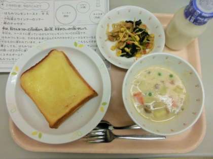 今日は、はちみつレモントースト、牛乳、小松菜とウインナーのソテー、森のチャウダーです。