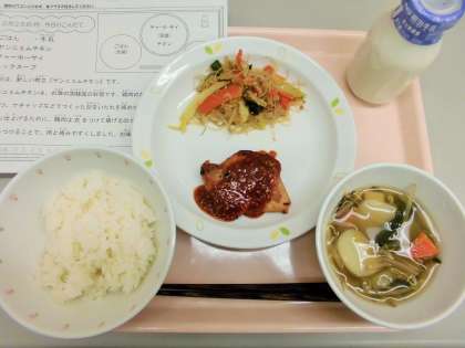 ごはん、牛乳、ヤンニョムチキン、チャーホーサイ、トックスープです。