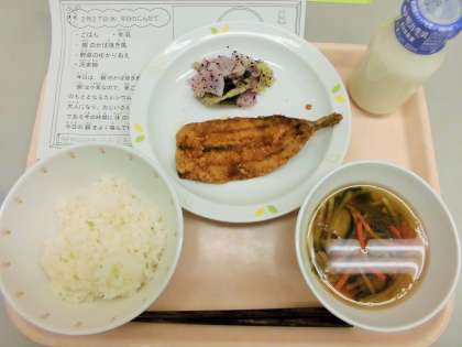 今日は、ごはん、牛乳、いわしのかば焼き風、野菜のゆかりあえ、沢煮椀です。