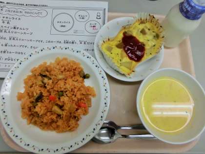今日は、チキンライス、牛乳、スペイン風オムレツ、豆乳入りコーンスープです。