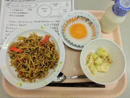 今日は、ソース焼きそば、牛乳、じゃがいもの香味和え、おかしな目玉焼きです。