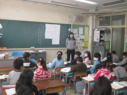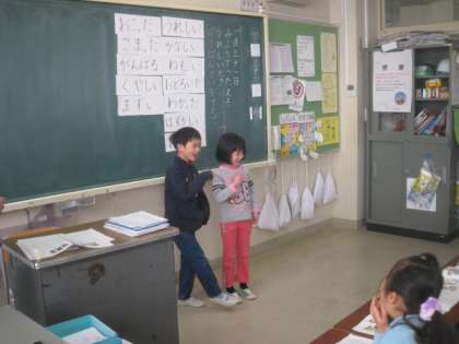 国語の授業でした。身振りで相手に伝える方が伝わりやすいことがあるという説明的な文章を読み取るために、動作化しながら理解を深めていました。1年生にとって、動作で表す授業は意欲的になります。