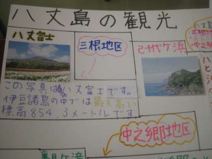 社会科の授業でした。八丈島の自然環境を生かした観光について、調べたことをもとに考えます。子どもたちは調べたことを上手にまとめ、上手に相手に伝え、なぜ観光が盛んななの考えていました。