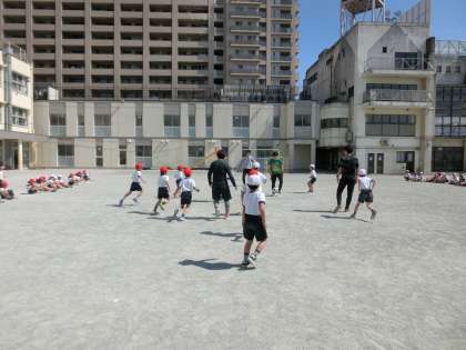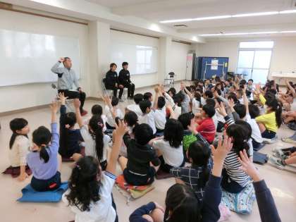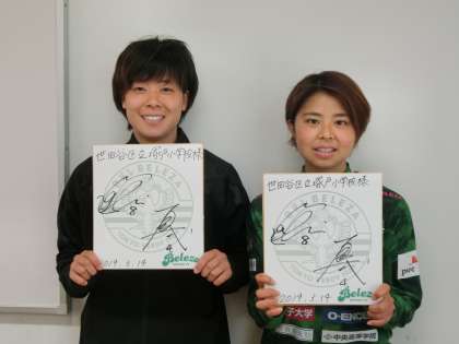 オリンピック・パラリンピック教育の一環として、日テレベレーザの土光真代選手や三浦成美選手、コーチの皆さまに来ていただきました。世界で戦う選手の皆さまから貴重なお話を聞くことができました。夢を持つことの大切さや世界で戦う厳しさ、好きな食べ物など様々なことを教えてもらいました。その後、校庭では選手・コーチの皆さんと白熱したサッカーのゲームをしました。日本代表選手の方とサッカーをしたことは子どもたちにとって、とても興奮する良い経験になりました。