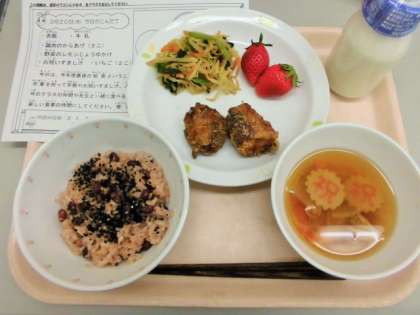 今日は、赤飯、牛乳、から揚げ、野菜のレモンじょうゆかけ、おいわい汁、いちごです。