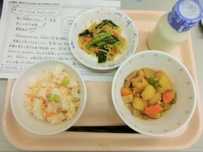 今日の給食は、鮭と枝豆のごはん、牛乳、肉じゃがうま煮、華風和えです。