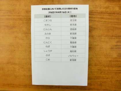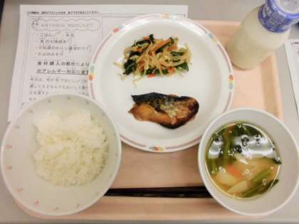 今日の給食は、ごはん、牛乳、魚の七味焼き、小松菜のからし醤油かけ、かぶのみそ汁です。
