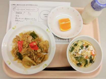 今日の給食は、回鍋肉丼、牛乳、卵とチンゲン菜のスープ、清見オレンジです。