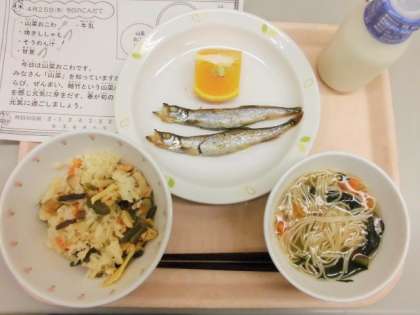 今日の給食は、山菜おこわ、牛乳、焼きシシャモ、そうめん汁、甘夏です。