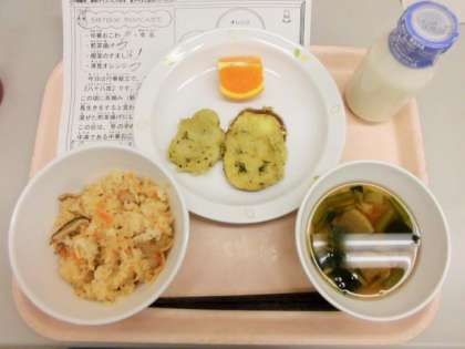 今日の給食は、中華おこわ、牛乳、煎茶揚げ、根菜のすまし汁、清美オレンジです。