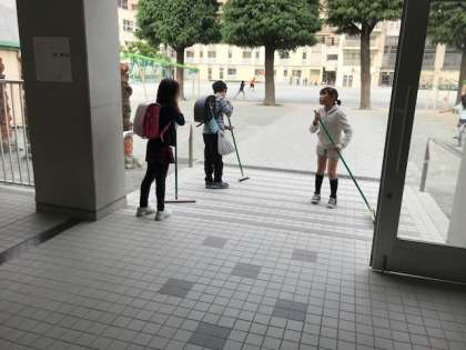 一緒に掃除をしながら話をしていたら、「葉っぱはレア。」「雨の日が一番砂が集まった。靴の裏に砂がついてくるから。」と掃除しながらも様々な事に気付き、学んでいるようでした。