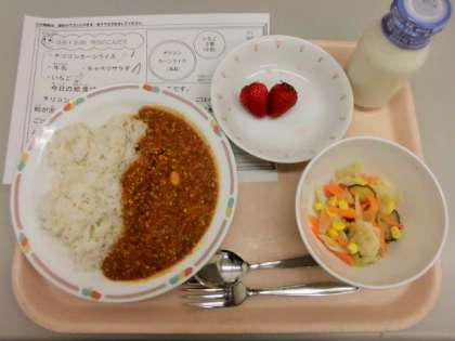 今日の給食は、チリコンカーンライス、牛乳、キャベツサラダ、いちごです。
