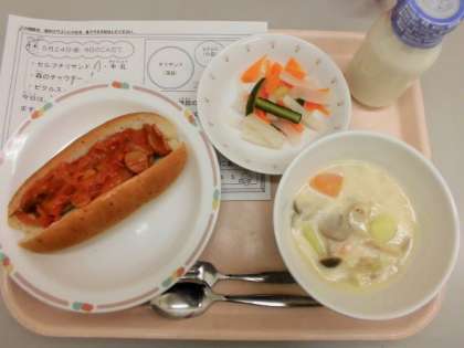 今日の給食は、セルフチリサンド、牛乳、森のチャウダー、ピクルスです。