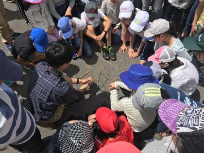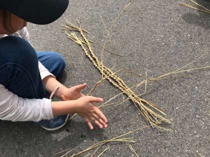 しめ縄づくりを体験しました。里山についての説明を聞いてからの制作です。
