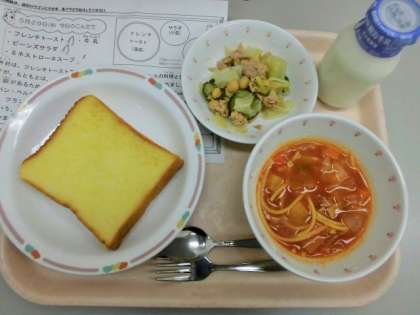 今日の給食は、フレンチトースト、牛乳、ビーンズサラダ、ミネストローネスープです。
