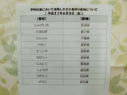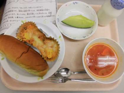 今日の給食は、あしたばパン、ポテトグラタン、トマトとエリンギのスープ、メロンです。