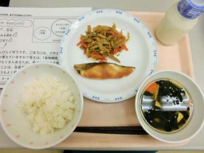 今日は、ごはん、牛乳、魚のゆずみそ焼き、きんぴらごぼう、ほうれん草のすまし汁です。