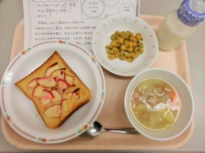 今日の給食は、アップルトースト、牛乳、ひよこ豆のカレー炒め、ポトフです。