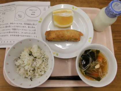 今日の給食は、菜めし、牛乳、春巻き、わかめスープ、宇和ゴールドです。
